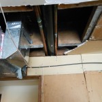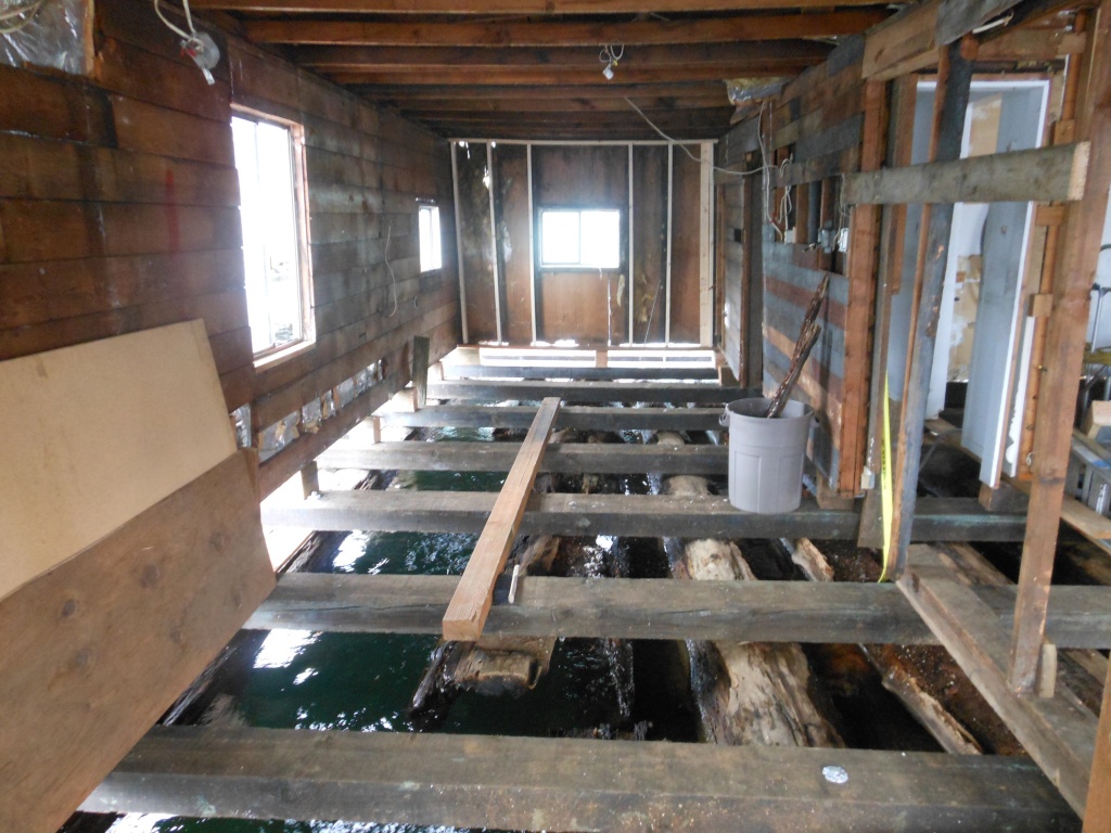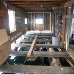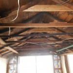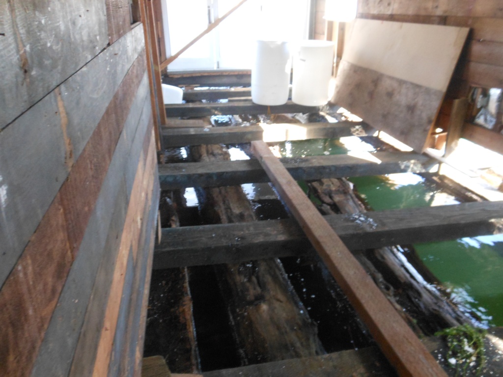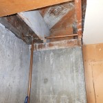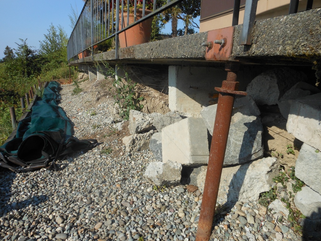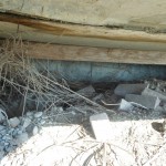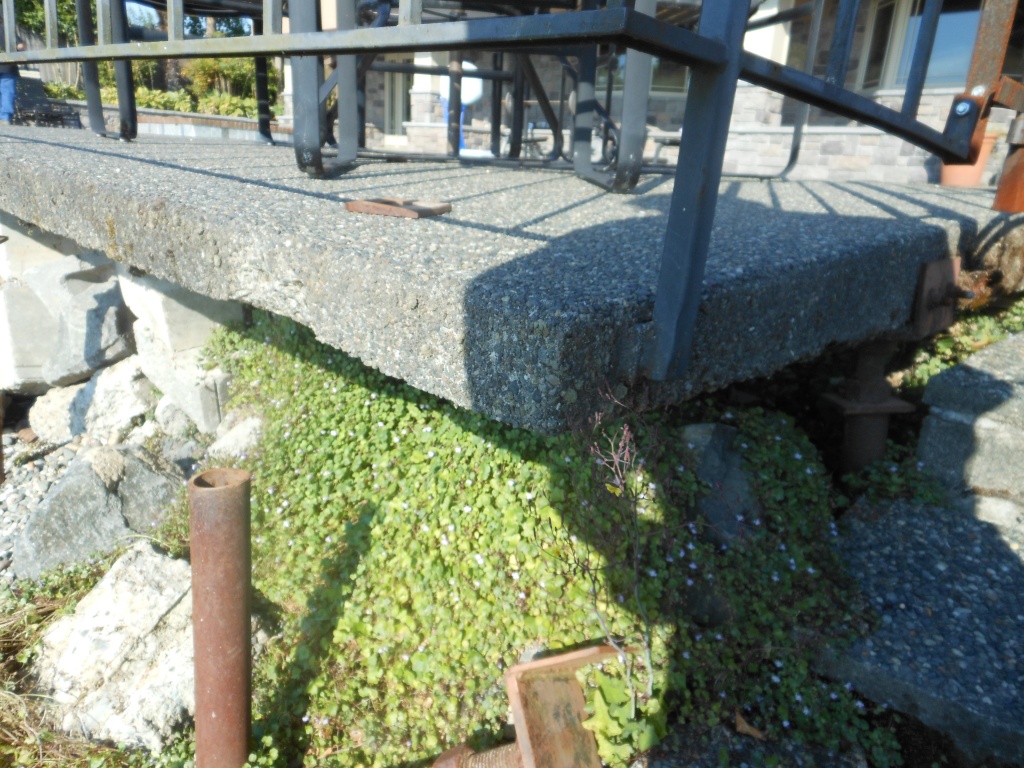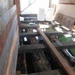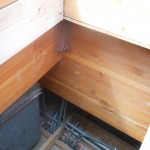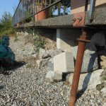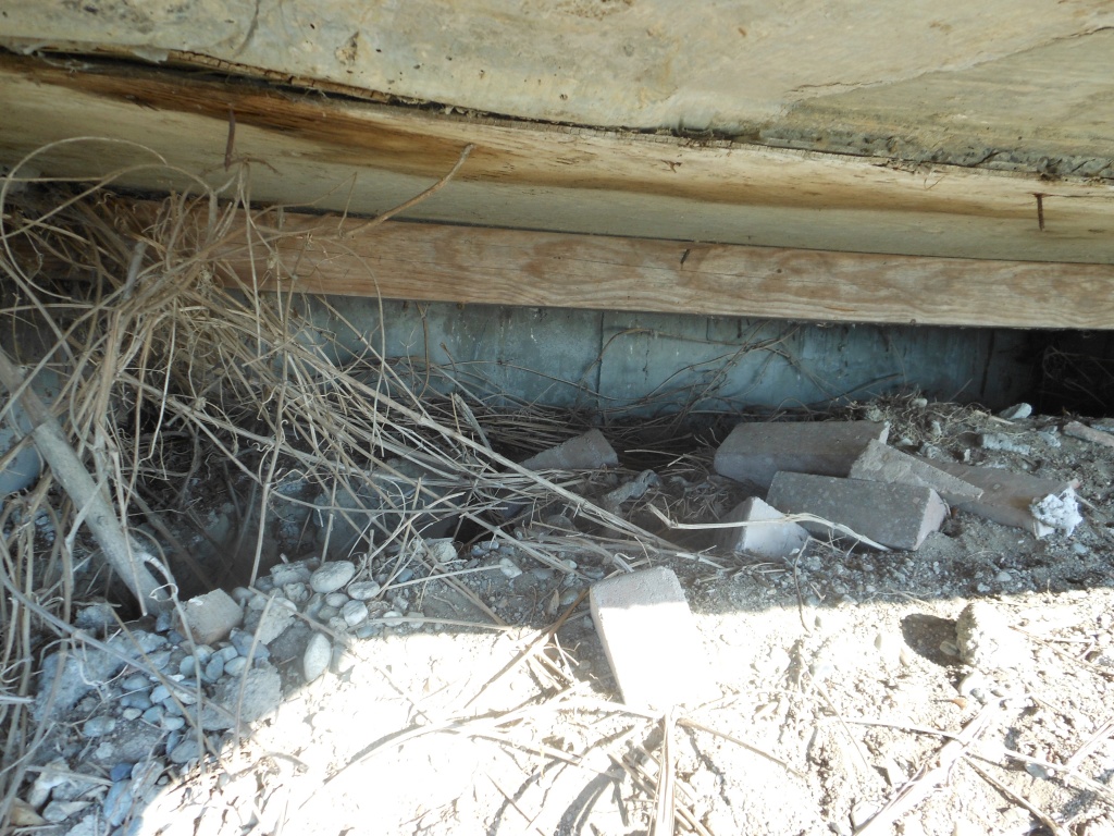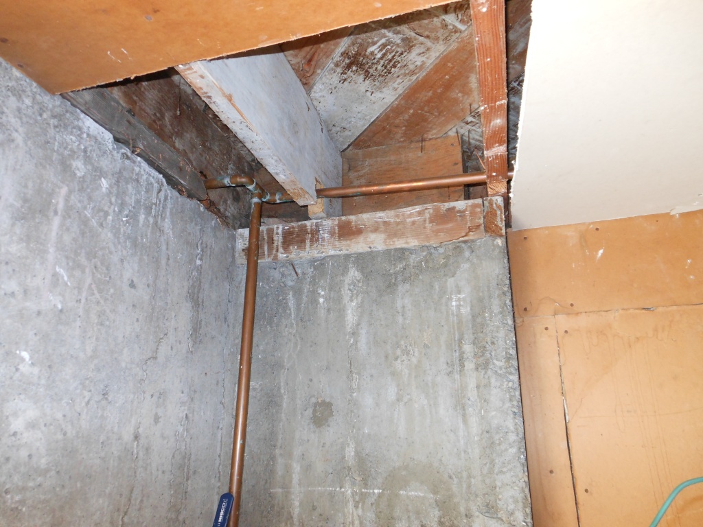 The floors of this upper floor cantilevered section sloped down towards the rear wall. The owner had lived with this condition for many years, but decided to consider a fix, as a part of a bathroom remodel upstairs. My inspection revealed a number of minor problems, including some settlement of existing footings, strange post configurations, and just a bit of dry rot. I met with the owner and his contractor, and was able to describe to them an appropriate way to correct these small problems.